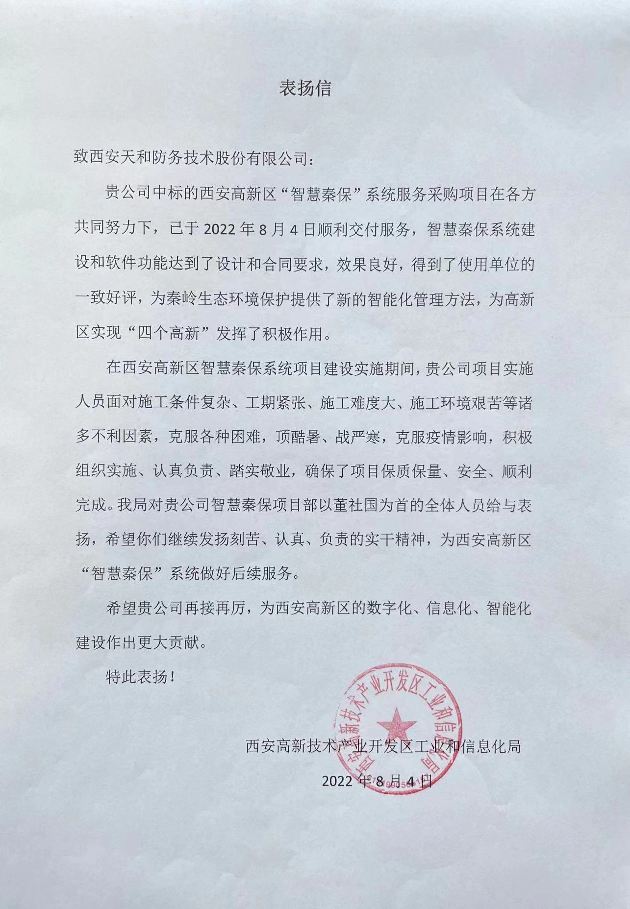 表扬信说,贵公司中标的西安高新区“智慧秦保”系统服务采购项目在各方共同努力下,已于2022年8月4日顺利交付服务,“智慧秦保”系统建设和软件功能达到了设计和合同要求,效果良好,得到了使用单位的一致好评,为秦岭生态环境保护提供了新的智能化管理方法,为高新区实现“四个高新”发挥了积极作用。