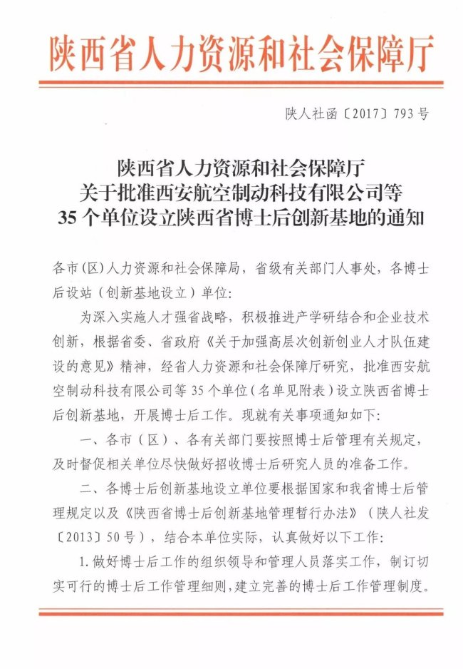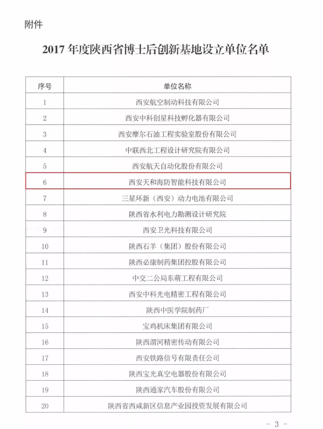 2017年11月,西安天和海防智能科技有限公司收到陕西省人力资源和社会保障厅《关于批准设立35个单位设立陕西省博士后创新基地的通知》(陕人社函〔2017〕793号),天和防务子公司——天和海防公司获批设立“博士后创新基地”。