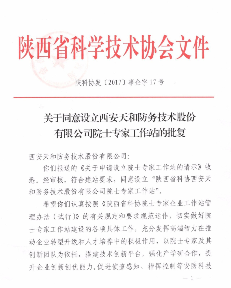 陕西省科学技术协会在批复文件中表示,希望天和防务公司认真按照《陕西省科协院士专家企业工作站管理办法(试行)》的有关规定和要求规范运作,切实做好院士专家工作站建设的各项具体工作,充分发挥高端智力在推动企业转型升级和人才培养中的积极作用,以院士专家及其创新团队为依托,搭建技术创新平台,强化产学研合作,提升企业创新创优能力,促进侦察感知、指挥控制等安防科技的研发应用,为陕西军民融合产业发展和实现“追赶超越”目标做出更大贡献。