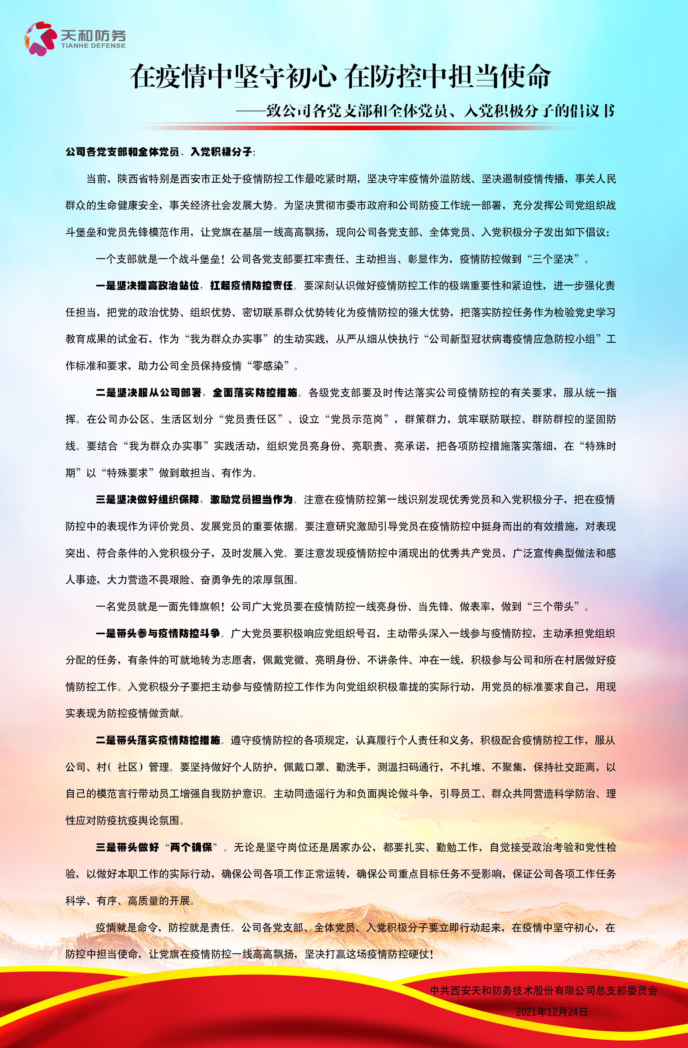当前,陕西省特别是西安市正处于疫情防控工作最吃紧时期,坚决守牢疫情外溢防线、坚决遏制疫情传播,事关人民群众的生命健康安全,事关经济社会发展大势。为坚决贯彻市委市政府和公司防疫工作统一部署,充分发挥公司党组织战斗堡垒和党员先锋模范作用,让党旗在基层一线高高飘扬,现向公司各党支部、全体党员、入党积极分子发出如下倡议:
